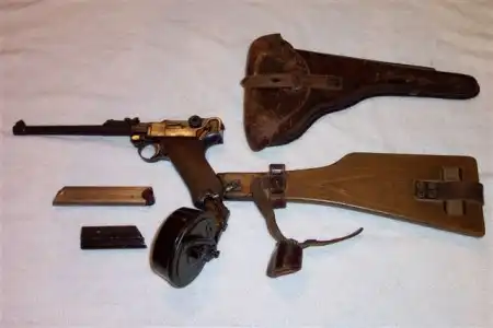 Luger-Parabellum с примкнутой кобурой-прикладом и барабанным магазином системы Леера