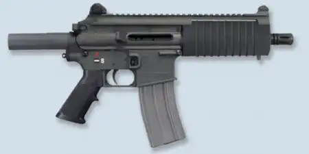 И, наконец, порождение сумрачного американского гения, который решил снабдить экипажи БТР и вертолётов укороченной версией винтовки М16А1 - штурмовой пистолет "Карбон-15". Представляет собой ствольную коробку М16 выполненную из сплава на основе углеродного волокна (собственно, карбона), с полностью идентичным внутренним устройством, но лишённый возможности стрелять очередями. Ствол укорочен. Отсутсвуют, так же, приклад и изменены прицельные приспособления. Не был принят на вооружение, как потерпевший поражение в конкурентной борьбе с "Кольтом" ХМ187, но очень ценится у коллекционеров.