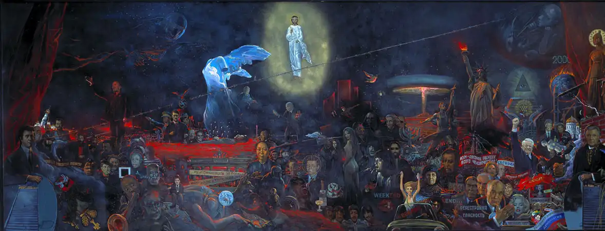 Картину "Мистерия XX века" по своему действию можно сравнить со взрывом атомной бомбы. ее первый вариант был написан в 1977 году, когда советское искусство захлебывалось от верноподданнической любви к Ленину, Хрущеву, КПСС и было строго ограничено рамками лжи социалистического реализма. Художник выполнил титаническую работу, показав на своей картине через конкретные образы людей апокалипсическое бытие XX века.