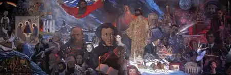 Предложение ЮНЕСКО великому русскому художнику Илье Глазунову создать панно, отражающее вклад народов СССР в мировую культуру и цивилизацию, было актом высокого международного признания его творчества. Но как решить столь сложную проблему — в одной картине отразить масштаб многовековых свершений более сотни народов и народностей, населяющих территорию бывшей Российской империи, а тогда СССР, раскинувшейся на шестой части Земли? Как известно, по решению ЮНЕСКО ежегодно отмечаются юбилейные даты, связанные с именами наиболее выдающихся творцов мировой цивилизации. И художник, представив узнаваемые хрестоматийные образы великих ученых, деятелей литературы и искусства разных национальностей, а также плоды их творческого гения, проявившегося в разные времена, создал образ воплощенной мощи своего Отечества в протяженности исторического бытия. Это произведение Глазунова, вызвавшее большой резонанс мировой общественности, было передано советским правительством в дар ЮНЕСКО и заняло место в одном из холлов штаб-квартиры этой организации в Париже. Ее Генеральный секретарь, выступая на церемонии передачи панно, сказал: "Мы уверены, что все, кто придет в ЮНЕСКО — мужчины, женщины, молодежь,— стоя перед этим творением, почувствуют заключенный в нем гуманный смысл, вдохновляющий на развитие творческих возможностей во имя счастья людей, мира и справедливости".