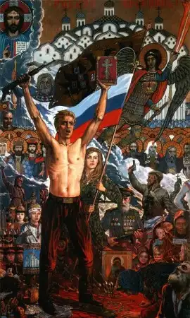 За ним сплотилось, кажется, все вселенское отребье. Матрос с винтовкой и пулеметом, орудием массовых казней; персонаж, выпускающий из мешка свинью с церковным крестом; блудница в генеральской шинели, накинутой на голое тело; баба в горностаевой шубе, добытой при осуществлении девиза “Грабь награбленное!”; “революционная семья” в венчальных коронах, на которых пришпилены пентаграммы... Известно, как во времена “великой французской революции” алтарь храма занимала голая проститутка... Известно и то, что ударной силой революций становились наемники - китайцы, латыши и другие, отличавшиеся особой беспощадностью в расправах с коренным населением. Вот и здесь мы видим китайчонка в офицерской фуражке.