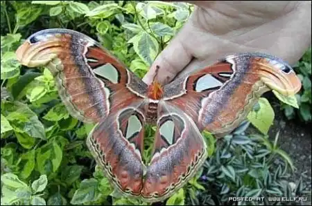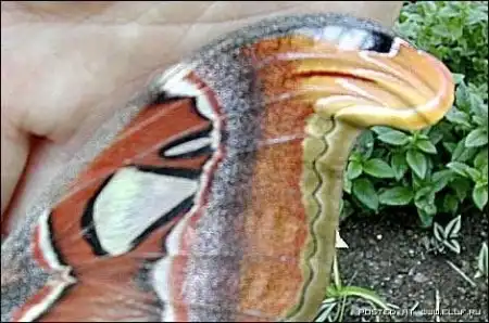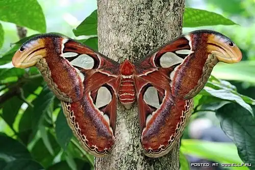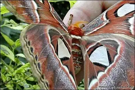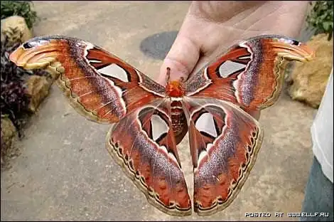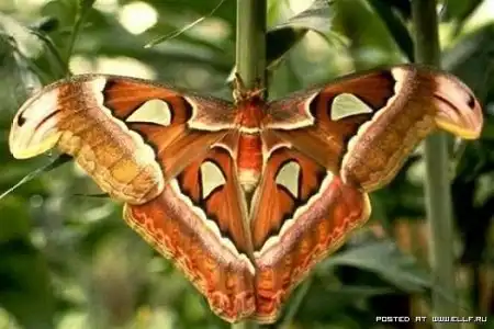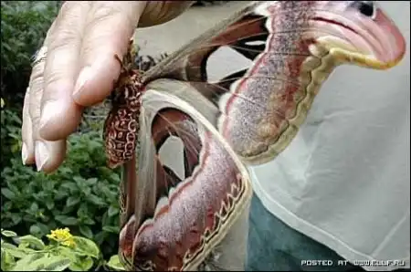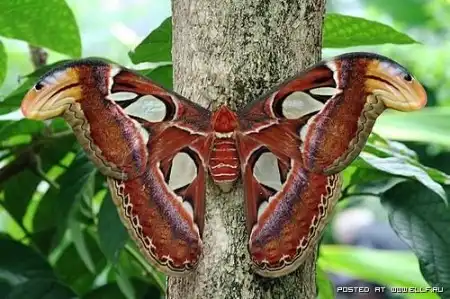 Attacus atlas (Павлиноглазка Атлас или Князь тьмы). Это самая большая ночная бабочка. Известно много подвидов - бабочка император, которая считается самой крупной в мире (крылья в размахе достигают свыше 32 см). Причудливо изогнутый край переднего крыла по форме и окраске имитирует змеиную голову. Это отпугивает многих насекомоядных животных