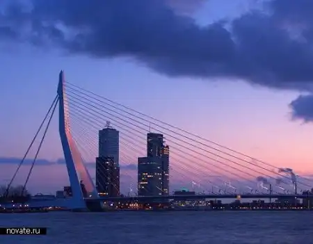 Эрасмусбруг - лебединый мост в РоттердамеИз-за необычной формы единственной опоры, мост в Роттердаме получил кличку «Лебедь». Он соединяет южную и северную часть города, отделенные друг от друга рекой New Meuse. Протяженность моста составила чуть более 800 метров, а затраты не превысили отметки 110 млн долларов. Благодаря необычному внешнему виду, мост привлек внимание кинематографа, и в 2005-м году в фильме “Кто я?” с Джеки Чаном, самолеты Red Bull Air Race пролетали.. под ним. Кстати, вскоре после открытия в 1996-м году и запуска транспортного движения по мосту, стало очевидно, что мост качается на ветру, и срочно понадобилось модифицировать его опору.