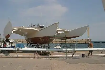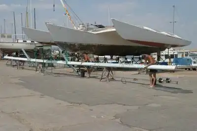 Однако начало было грустным. Во время первой зимней стоянки в Черноморском яхтклубе произошло ЧП. На плохо охраняемую территорию проникли бомжи и устроили внутри тримарана небольшой костер. В результате мы смогли убедиться в преимуществах стеклопластика. Все деревянные элементы внутри салона выгорели, но корпус уцелел, хотя его все же несколько "повело" от воздействия температуры.