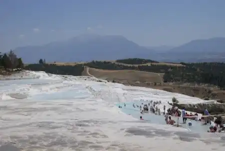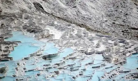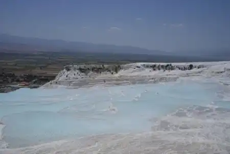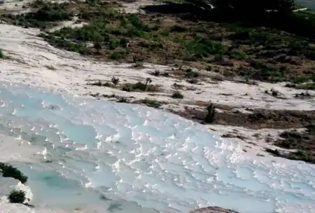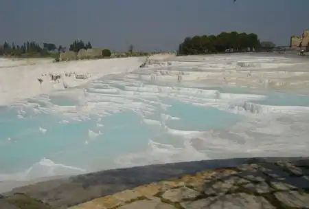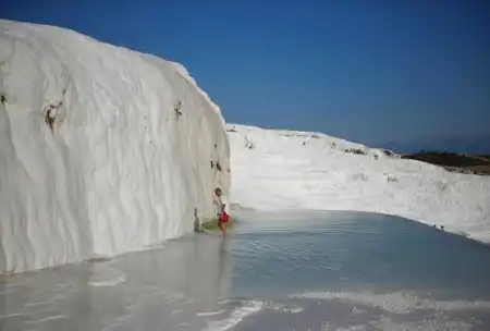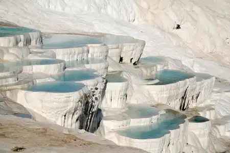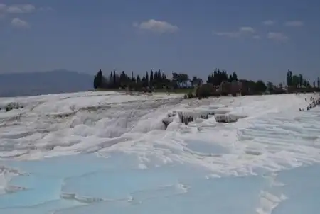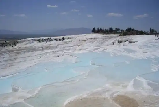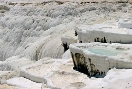 Вода, стекающая со склонов горы образует систему причудливых водоёмов с известняковыми стенами (травертинами). Ослепительно белые террасы (травертиновые образования) возникли на склоне горы в результате отложения солей из насыщенных кальцием источников. Раньше по соляным террасам разрешалось гулять босиком, но из-за многочисленности туристов, ежегодно посещающих Памуккале, это запретили. Теперь можно гулять по тропинке или любоваться великолепным зрелищем издали. Эти места используются как курортная местность с античных времен. В 1988 Памуккале и руины города Гиераполиса включены в список Всемирного наследия ЮНЕСКО.