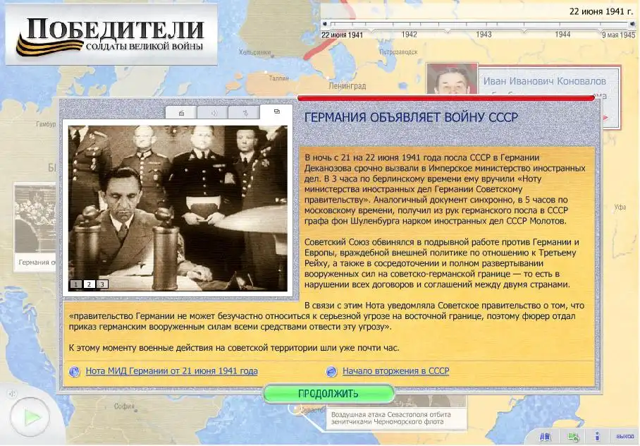 Мемориальный сайт "www.pobediteli.ru" закончил размещение мультимедийной модели хода ВОВ. Это рассказ о событиях с 22 июня 1941 года по 9 мая 1945 года, выполненный в виде интерактивной презентации на основе технологии Macromedia Flash.