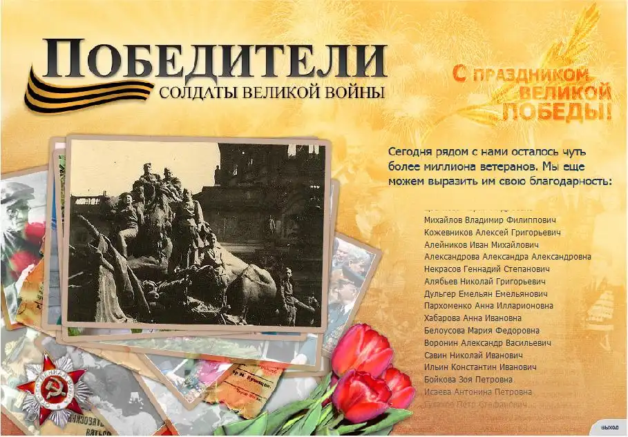 Данный архив victors.rar содержит оффлайн версию сайта а также саму мультимедийную презентацию. Архив нужно распаковать, зайти в папку victors, и запустить файл index.html, тем самым вы запустите оффлайн сайт www.pobediteli.ru, а через него и сам файл презентации прямо в вашем броузере, а также можно просто сразу запустить файл презентации victors.swf через броузер или флэш плэер.