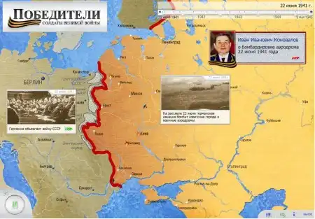 Данная карта наиболее полно представляет ход ВОВ, посредством фотографий и динамических объектов с подписями, аудио записями ветеранов, рассказывающих об отдельных частях войны, а также различными документами, которые вы можете смотреть и слушать по своему желанию. По годам можно свободно перемещаться с помощью временной линейки.