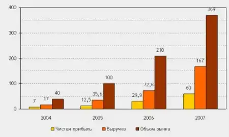 На протяжении всех 7 лет Яндекс развивался по экспоненте. Сложно сказать будет ли рост оставаться экспоненциальным в ближайшие годы, но то, что это будет именно рост, а не коллапс - очевидно. Главный фактор дальнейшего роста компании – взрывообразное расширение рынка интернет-рекламы, в 2007 г. он составил 369$ млн. (для сравнения, рынок интернет-рекламы в США – 25,5$ млрд.). Пока это всего 2,6% всего рекламного рынка, но дальше эта доля будет увеличиваться, находясь в русле мировых тенденций. Например, в США, являющихся мировым лидером по объему рынка интернет-рекламы, его доля уже составляет 7,4% и продолжает расти. В то же время, расти будет и весь рекламный рынок.
