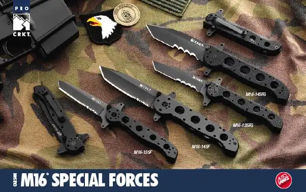 Во всех моделях выполнен специальный выступ клинка «Carson Flipper», который помогает раскрывать нож, а также действует как дополнительная гарда клинка. Это позволяет с особой лёгкостью раскрывать ножи серии «M16», когда у Вас на руках перчатки. Каждая модель имеет съёмную покрытую тефлоном карманную клипсу, выполненную из нержавеющей стали. В конструкции всех трёх ножей серии «M16» использован запатентованный блокиратор клинка «LAWKS», при включении которого они превращаются фактически в фиксированные клинки. В 2004 году германский журнал холодного оружия «Messer Magazine» провёл скрупулёзное сравнение шести ведущих тактических складных ножей. По результатам тестирования прочности клинка и запирающего механизма, сохранения режущей кромки, работы ножа и его цены редакторы журнала заявили: "Нож «М16 Columbia River» выиграл приз… Нож прошёл испытания на качество без единого изъяна".