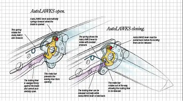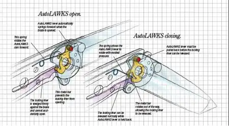 Складные ножи этой фирмы оснащаются системой блокировки замка LAWKS, препятствующей случайному складыванию лезвия под нагрузкой.