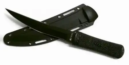 Изготовленные вручную формованием полиамидные ножны прочно фиксируют нож и имеют съёмную поясную клипсу, которую можно прикрепить, использованием прилагаемых винтов, в верхней или нижней части ножен, справа или слева. Также в теле ножен присутствует множество отверстий и пазов, позволяющих носить их, закреплёнными к ремням, тесьмам или экипировке.