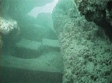 Плотно уложенные блоки толщиной в 30 сантиметров. Каждый из них правильной формы. Вымощенный участок уходит в песок. Хорошо видно ступени. Напоминает дорогу, уходящую в глубь моря…