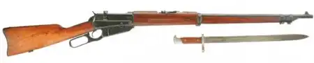 винтовка Winchester M1895 Русского образца, под патрон 7.62x54R. Винтовка имеет направляющие для обойм на ствольной коробке, прилив для крепления штыка на переднем ложевом кольце, и укомплектована клинковым штыком американского образца