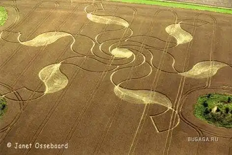 Кстати, поначалу официально утверждалось, что круги были сделаны двумя стариками по имени Дуг и Дейв, которые клялись, что это их работа. Но когда в телеинтервью им показали некоторые фигуры, Дуг и Дейв вдруг сообщили, что никогда такого не делали. После Дуга и Дейва многие мошенники пытались присвоить себе авторство кругов, и, как доказано учеными, примерно 30% кругов точно сделаны человеком. Но специалисты говорят, что отличить поддельные круги от настоящих можно по следующим признакам: если у подделок колосья просто сломаны и примяты к земле, то у настоящих они именно согнуты; у подделок колосья не закручены; у настоящих фигур колосья бывают примяты в несколько слоев, причем колосья в них закручены в разные стороны; настоящие фигуры поразительно точны в геометрическом смысле, края фигур четко очерчены; настоящие фигуры никогда не изображают никаких рожиц, велосипедов, "веселых роджеров" и т.п.