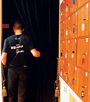 Все вещи: сумки, зонты, а главное, предметы, являющиеся источниками света (мобильные телефоны, зажигалки, ручки, часы с подсветкой), гости оставляют в специальных ячейках-сейфах.