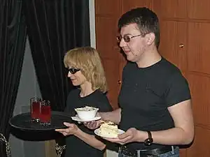 В зал гости заходят, следуя за своим проводником - незрячим официантом.