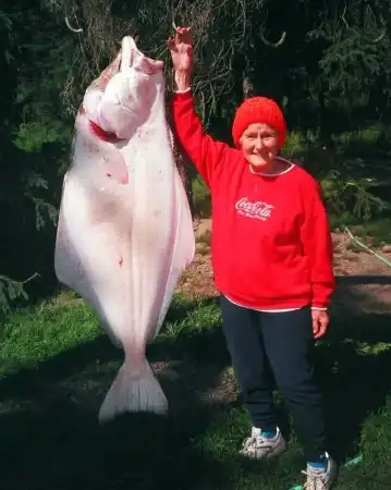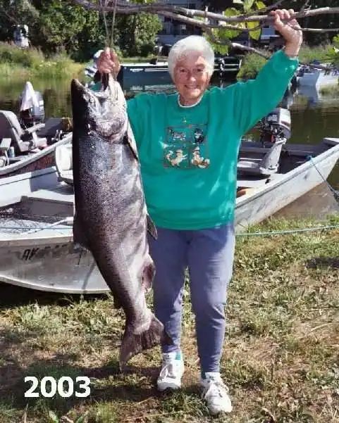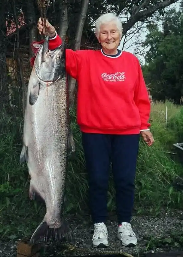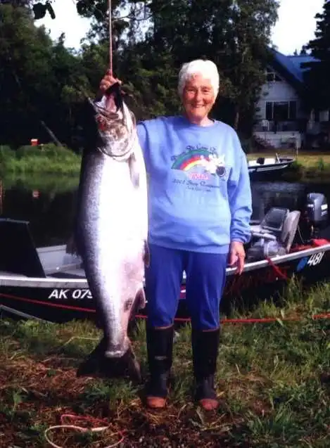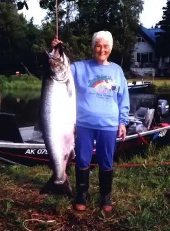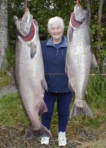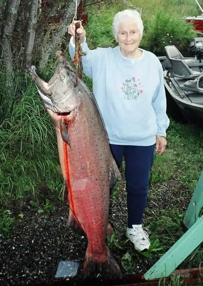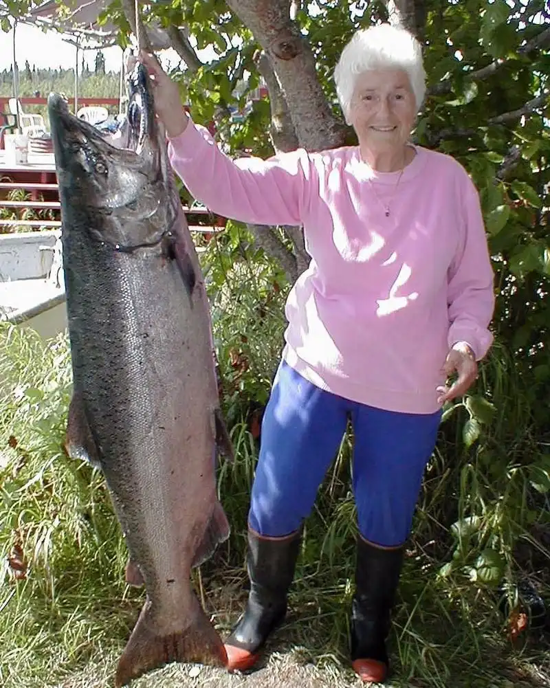 На фото одна и та же дама - Джанет Ларсен, пристрастившаяся к рыбалке. Фото сделаны в разное время, но они сделаны на Аляске, я точно знаю). Так вот пенсионерка тащит не по деЦки.