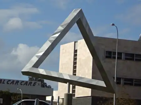 Это фотография реально существующей скульптуры невозможного треугольника, установленной в городе Перт (Австралия).