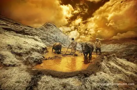 Утром в деревне Ката Кат, где очень плодородная гористая область, фермеры готовят землю, чтобы сеять семена риса, используя для этого «тракторы»...