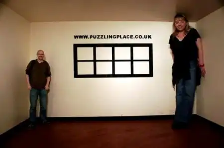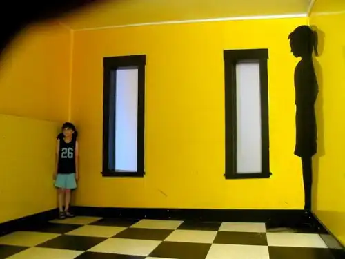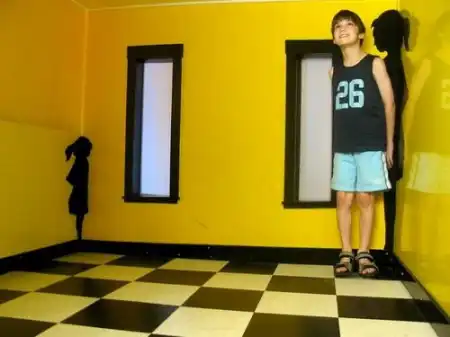 Комната Эймса была сконструированная художником и психологом Адельбертом Эймсом в 1946 году. Дальняя стена комнаты расположена не под прямым углом к боковым стенам, как это обычно бывает, а под очень острым углом к одной стене и, соответственно, под тупым углом к другой. Благодаря ложной перспективе, созданной в том числе узорами на стенах и полу (в данном случае - черно-белые клетки), наблюдатель воспринимает эту комнату прямоугольной. В результате оптической иллюзии, человек, стоящий в ближнем (к наблюдателю) углу такой комнаты, выглядит великаном, а находящийся в дальнем углу - карликом. При передвижении человека из одного угла в другой, создается ощущение, что он увеличивается в размерах или уменьшается.