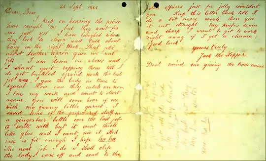 "Со всех сторон до меня доходят слухи, что полиция меня поймала. А они до сих пор даже не вычислили меня. Я охочусь на женщин определенного типа и не перестану их резать до тех пор, пока меня не повяжут. Последнее дело было великолепной работой. Леди не успела даже вскрикнуть. Я люблю такую работу и готов ее повторить. Скоро вы вновь узнаете обо мне по забавной проделке. Закончив последнее дело, я прихватил с собой чернила в бутылочке из-под имбирного лимонада, чтобы написать письмо, но они вскоре загустели как клей, и я не смог ими воспользоваться. Вот я и решил, что взамен подойдут красные чернила. Ха! Ха! В следующий раз я отрежу уши и отошлю их в полицию, просто так, ради шутки".