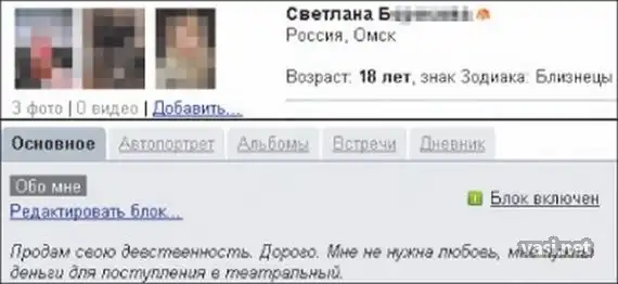 18-летняя студентка Омского института культуры продала свою девственность за 10тысяч долларов, чтобы переехать в Москву и поступить там в театральный вуз. Девушка выставила свою честь на интернет-торги. На сайте знакомств Светлана Б. разместила объявление: "Продам свою девственность.Дорого. Мне не нужна любовь, мне нужны деньги для поступления в театральный".