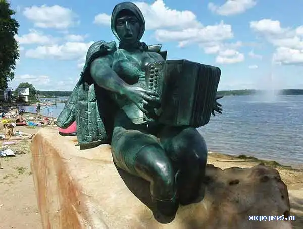 Наша русалка отличается от заграничной телогрейкой, гармошкой и платком на голове. К тому же наша, похоже, еще и поет что-то бодрое. О том, что это русалка, а не просто рядовая колхозница, говорит вид сзади.