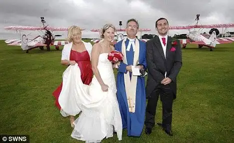 К счастью, Даррену Макуолтерсу и Кэти Ходгсон удалось найти и священнослужителя, который увлекается авиаспортом. Три биплана летели со скоростью 161 километр в час: на одном из них был закреплен 24-летний жених в смокинге, на втором - 23-летняя невеста в полном подвенечном уборе, а на третьем - священник. Клятвы любви и верности влюбленные произносили в специальные микрофоны - так что всю церемонию могли слышать гости, наблюдавшие за молодоженами со взлетной полосы. А вот кольцами пара обменялась уже на земле, перед тем как перейти к вечеринке