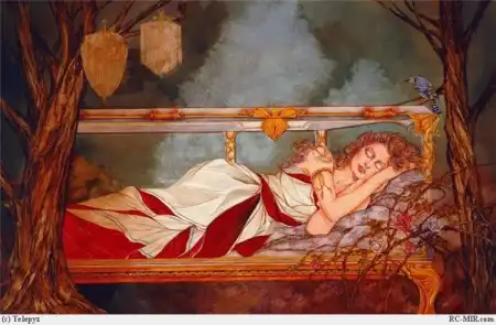 Когда она родилась, колдунья предсказала ей страшную смерть - она погибнет от укола отравленного веретена. Её отец приказал унести из дворца все веретена, но красавица - её звали Талией - всё-таки укололась веретеном и упала замертво. Король, её безутешный отец, посадил безжизненное тело дочери на обитый бархатом трон и приказал отнести Талию в их небольшой домик в лесу.