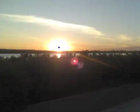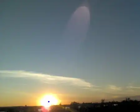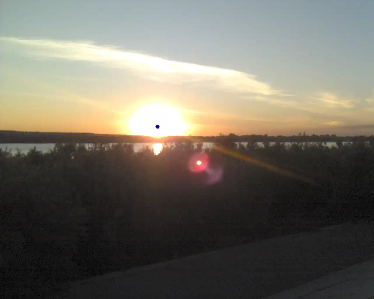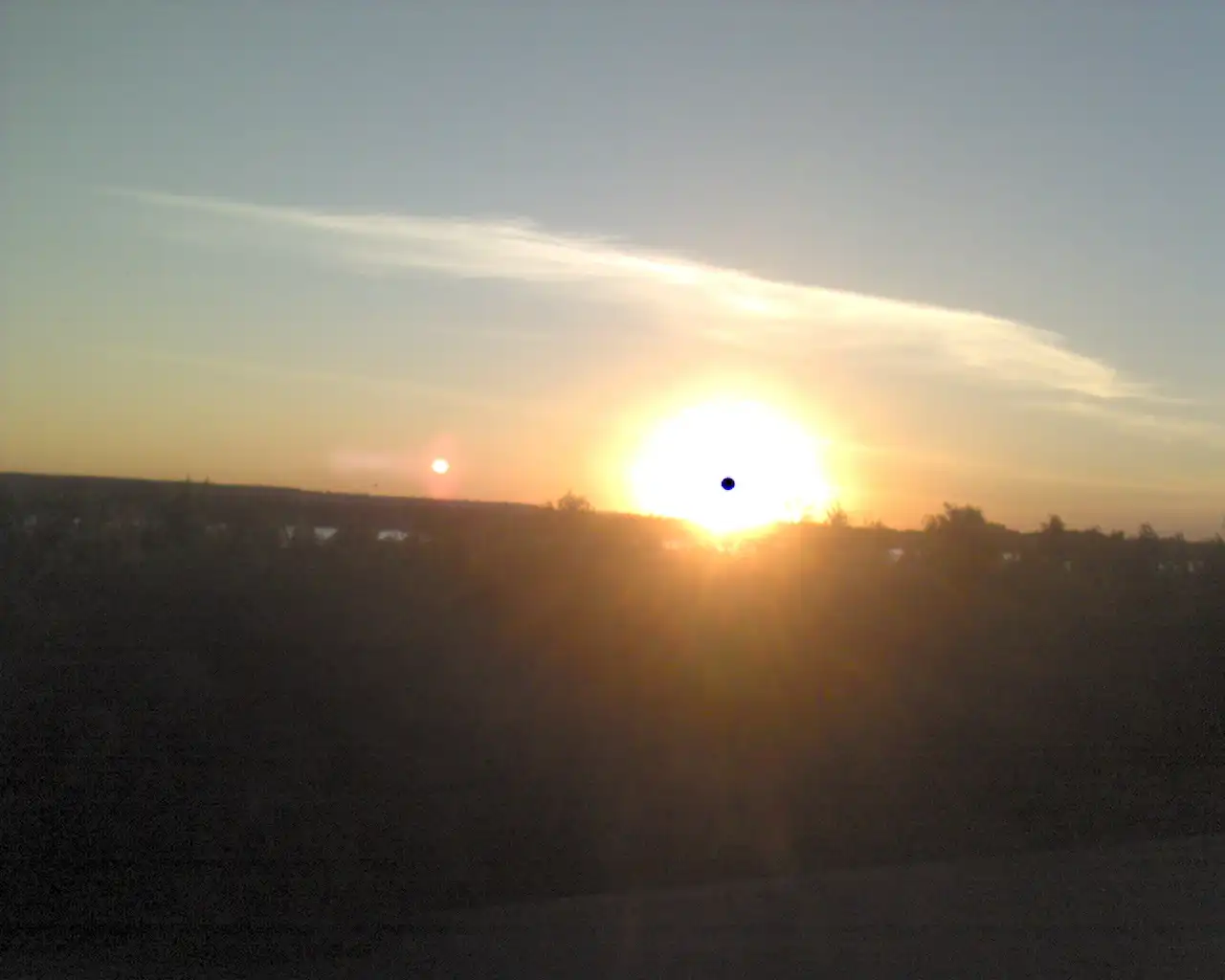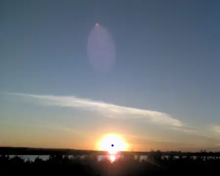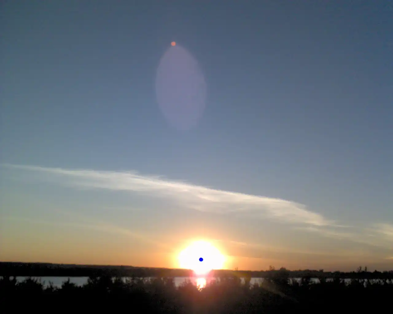 Расскажите что это такое! Фотографию делали в день бесконечности.(8 Августа 2008) на набережной с Сони Эриксона, когда наводили объектив на солнце появлялась точка, на другой - объект точка пропадала. Попробовали с другого телефона..эффект тот же! Звезд не было на небе, объектив был чистым!