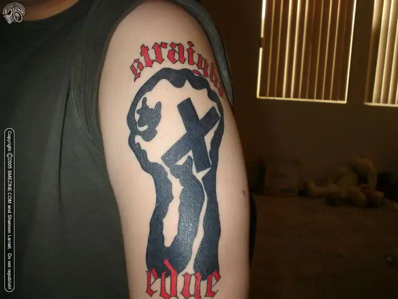 Словосочетание STRAIGHT EDGE (состоящее из «straight», т.е. «прямой», и «edge», т.е. «грань», «линия») можно дословно перевести как «прямая линия», но в разговорном языке это выражение обозначает проверочную линейку. Т.е., становясь стрейтэджером, человек проверяет прочность своих убеждений. Одним из символов STRAIGHT EDGE движения стал крест (Х). Первоначально при входе в клубы охранники ставили на руку несовершеннолетним крест трудно смывающейся краской. При наличии креста бармен не имел права наливать подростку спиртное. Так стрейтэджеры и стали татуировать крест на своих руках, чтобы показать, что они сознательно отказываются от спиртного и далее – символически – от всего, что может разрушить тело, душу или сознание. Стрейтэджеры рисовали крест на тыльной стороне ладони на концертах в знак того, что они не желают мириться с присутствием алко быдла и курящих на хардкор шоу. Однако, некоторые решали эти проблемы более оригинальным способом. Так, например, суппортеры Society System Decontrol, среди которых преобладали скинхэды, рисовали кресты на своих лбах и избивали любого, кто посмел закурить на концерте или выпить пива. Уже в 1983 году Minor Threat распадаются. Ian McKay взял троих музыкантов из другой распавшейся хардкор группы Faith и сформировал проект Embrace. В 1985 году Embrace записали свой первый и последний альбом, изданный лишь два года спустя. Группы класса The Teen Idles и SSD постепенно сходят со сцены.