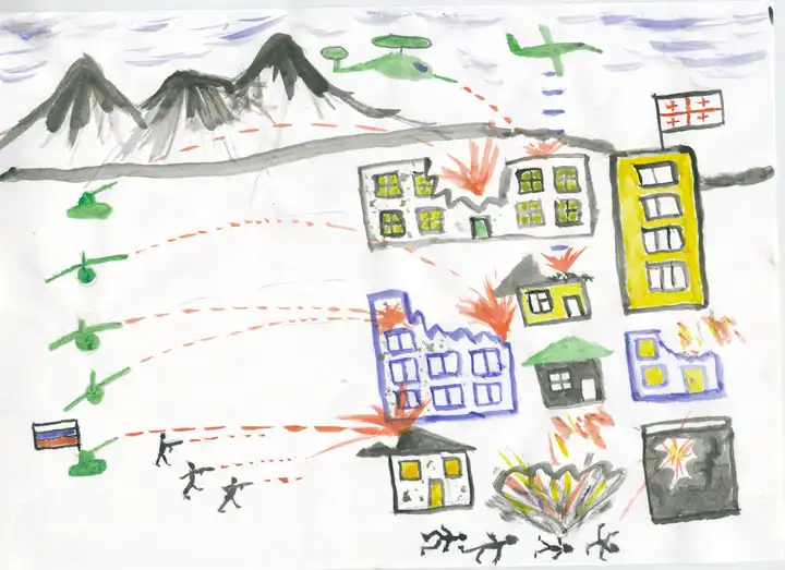 Алечка пишет нам: "Грузины плохие. Они решили взорвать памятник хорошему дедушке Сталину. Они уже зажгли спичку. Но русские войска уже подоспели на помощь и стреляют из пушки по врагам, чтоб они не взорвали памятник хорошему дедушке Сталину. А в доме на третьем этаже как бы сижу я и это как бы я вызвала российские войска. А рисовать памятник дедушке Сталину мне помогала бабушка Тая."