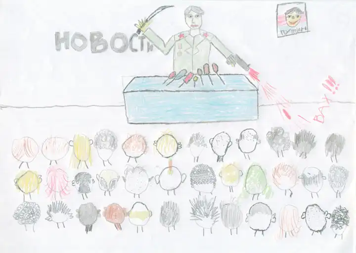 Лёша нам написал такое: "Папа очень обрадованный и другие дяди тоже очень обрадованные. Потому что наши победили непослушных грузинов и всех других плохих. Все очень радые. А Маринка наресовала только цветочек а я всё остальное"
