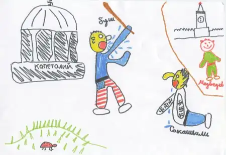 Настя пишет нам: "Буш вызвал Сакашвили в столицу Америки и ругает его что он дурак и проиграл войну и лупит его палкой. А Дмитрий Анатольевич Медведев в Москве радуется"