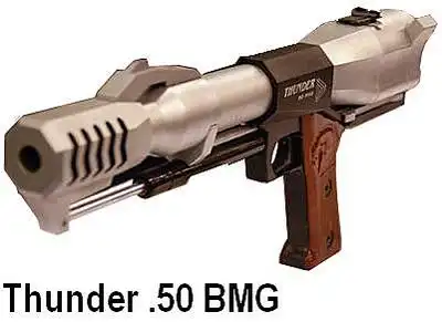 Однозарядный пистолет под сверхмощный патрон 12,7x99мм винтовочного типа. Пистолет оборудован дульным тормозом для снижения отдачи.
