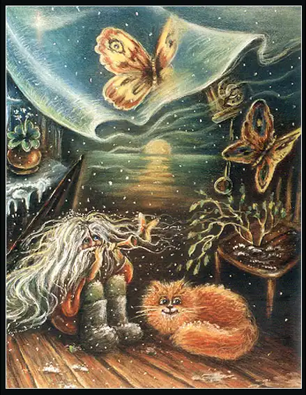 Обычно домовой спит где-нибудь под потолком. Да, он умеет летать, и на него сила земного притяжения не действует. В свободное ото сна время он бродит по квартире, занимается своими делами, играет с животными.