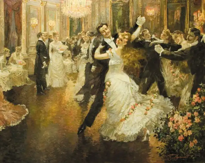 Вторым танцем был вальс...а за ним шли другие танцы, в частности, танцевали венгерку, краковяк, падепатинер, падеспань, падекатр... кульминацией бала была мазурка, и завершал балы котильон. Кавалеры на балах заранее записывались, приглашая дам на разные танцы. После мазурки кавалер вел даму к столу на ужин, где можно было пообщаться и даже признаться в любви. Ужинали все в боковых гостиных, за небольшими столиками. За каждым столиком гости собирались своей компанией. Кроме того, на балах всегда был открыт буфет с разными яствами, шампанским и прочими горячительными и прохладительными напитками. Ужин заканчивался в 11-м часу, после чего играли русскую и гости пускались в пляс. Когда хозяин давал знать, то музыка прекращалась, и все разъезжались по домам. Хозяин целовал ручки дам и прощался до... следующего бала...