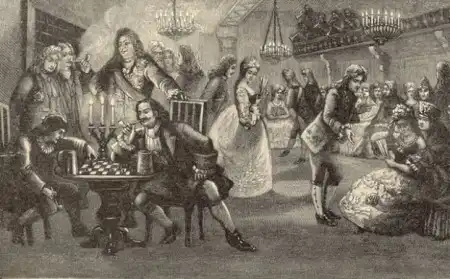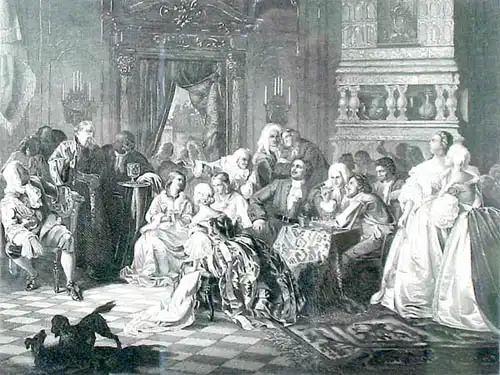 Конечно, ассамблеи времен Петра, не отличались утонченностью обстановки. В первую пору все делалось просто: в той комнате, где обедали и ужинали, слуги, убрав столы, подметали пол вениками, раскрывали зимою окна, чтобы проветрить помещение, пропитанное запахом кушанья и прокопченное кнастером, и затем в той же самой комнате разодетые кавалеры и дамы принимались за танцы. Это происходило от тесноты тогдашних петербургских домов, почему во время собраний, большею частью, не было общего для всех ужина, а гости делились на две группы: когда одна ужинала, другая танцевала. Кроме того, петровские ассамблеи отличались попойками, и спаивание не только мужчин, но и дам было явлением обыкновенным. Тем не менее ассамблеи в какие-нибудь три-четыре года после их принудительного учреждения до такой степени привились в преобразованном русском обществе, что сделались для него потребностью, и еще через несколько лет превратились в такие балы, которые по их приличию и чопорности мало чем уступали изящным версальским собраниям.