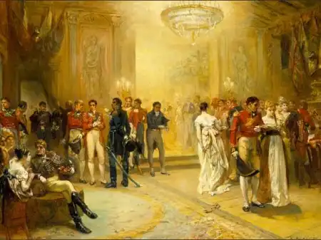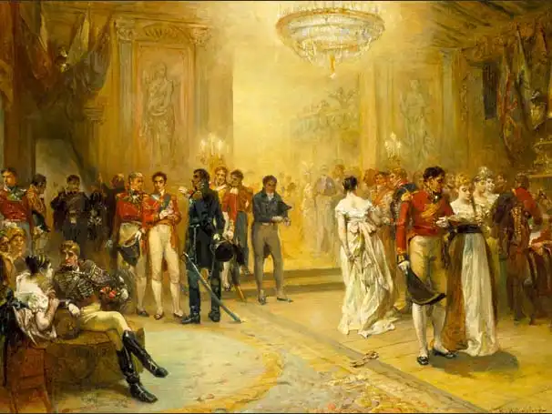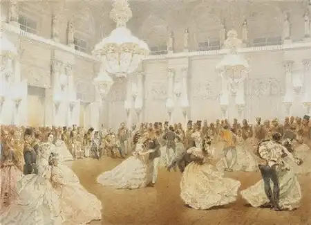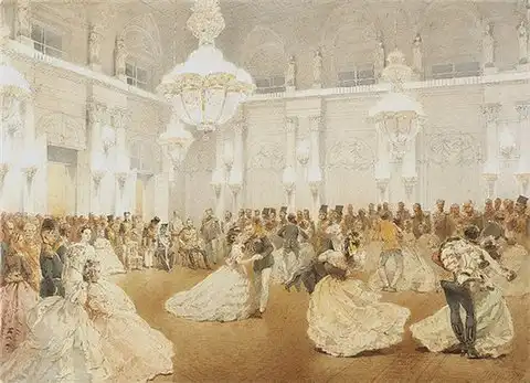 Балы проходили в огромных и великолепных залах, окруженных с трех сторон колоннами Зал освещался множеством восковых свечей в хрустальных люстрах и медных стенных подсвечниках В середине зала непрерывно танцевали, а на возвышенных площадках по двум сторонам залы у стены стояло множество раскрытых ломберных столов, на которых лежали колоды нераспечатанных карт Здесь играли, сплетничали и философствовали. Бал для дворян был местом отдыха и общения.