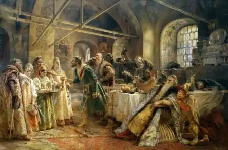 Среди этого люда, первое место занимали бедные дворяне, называвшиеся «знакомцами»; они всегда делили досуг и трапезу знатного боярина, шли перед ним, когда он выезжал куда-нибудь и, составляя его охранную стражу, всюду принимались с ним вместе и чествовались, как гости. Второе место занимал шут, являвшийся, так сказать, источником вседневной утехи каждой богатой семьи; на обязанности его лежало возбуждать смех, веселость, и он достигал этой цели или острыми, или пошлыми, но всегда необычайными словами и поступками, причем самый грязный цинизм был здесь не только уместен, но и заслуживал общее одобрение. За шутом следовали бахирь, или сказочник, домрачеи и гусельники. Бахирь рассказывал разные сказки, были и небылицы; домрачеи пели песни, былины, духовные стихи, подыгрывая на струнном инструменте, похожем на гитару и называвшемся домрой; гусельники забавляли слушателей игрой на гуслях. Иногда являлись скоморохи, скитавшиеся, большею частью, артелями и состоявшие из всякого рода «умельцев», музыкантов, «глумотворцев», «шпыней», плясунов и т. п. Несмотря на преследование, скоморохи умели обманывать бдительность властей, и ворота боярских домов радушно растворялись перед ними, так как естественная потребность в увеселениях и развлечениях чувствовалась всеми. Челядь в боярских домах была всегда многочисленная. Дворецкий и конюший считались старшими лицами мужской прислуги, а няня распоряжалась женскою, т. е. разными мамушками, сенными девушками и т. п., и ведала все домовое хозяйство.