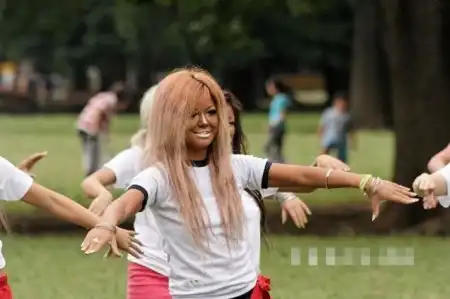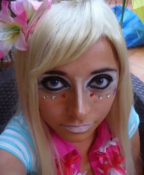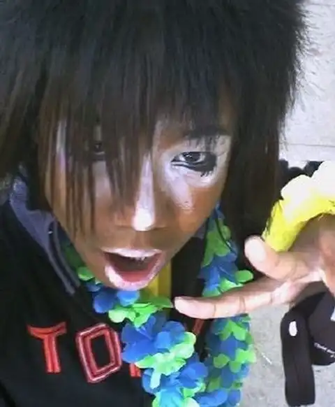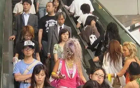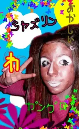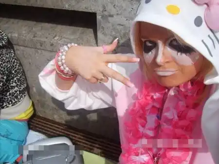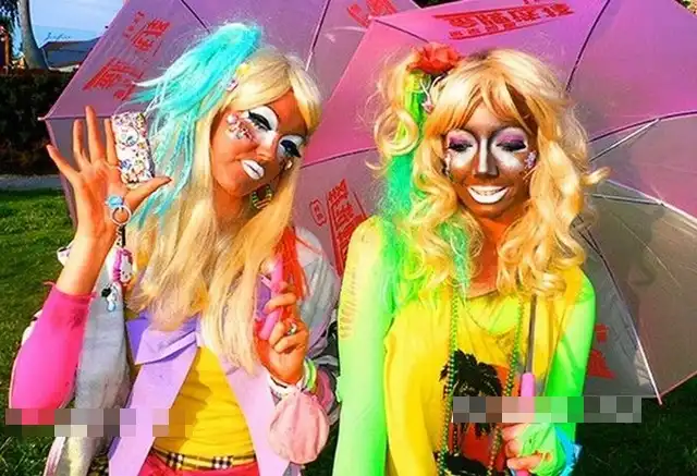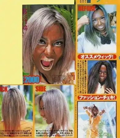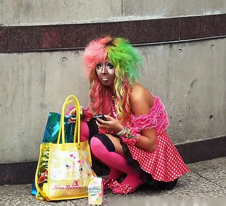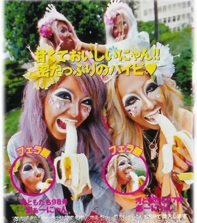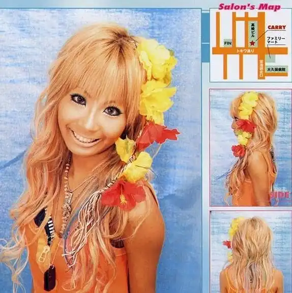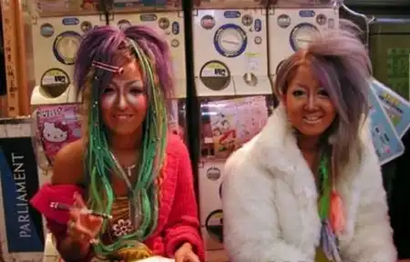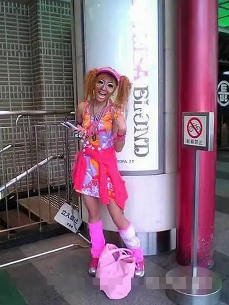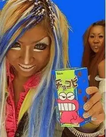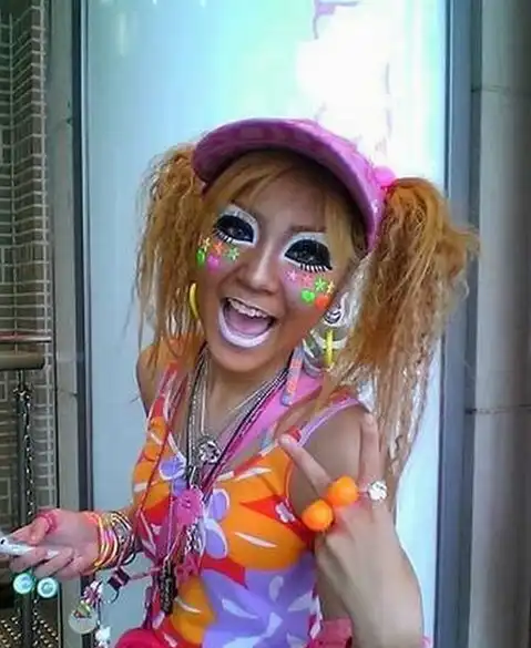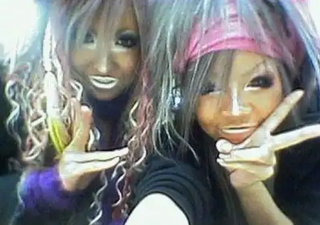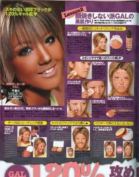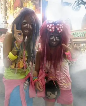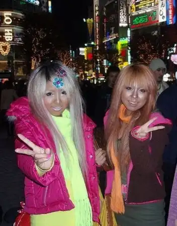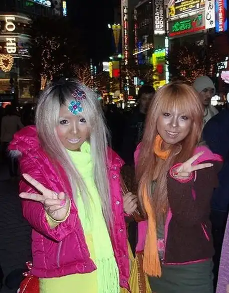 Для гангуро характерны глубокий загар и выжженные добела волосы. Также актуальными цветами волос являются оттенки оранжевого и серебристо-серые. Глаза гангуро подкрашивают белыми тенями и подводят белой подводкой. Нужно ли говорить, что губная помада тоже белого цвета? :) Также на глаза наклеиваются накладные ресницы, накладываются белые тени, а по всему лицу гангуро иногда размещают различные мелкие наклейки в виде сердечек-ромбиков и прочей мелочи, а также стразы. В общем,смахивает на наших эмо,но повеселее))