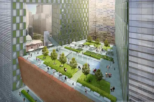 Двухэтажный высотный мост будет открывать прекрасный вид на улицы мегаполиса и соединять офисную башню с отелем. Схема также будет включать подземный переход, напрямую соединяющий конструкцию и её работников с главной линией метро Филадельфии.