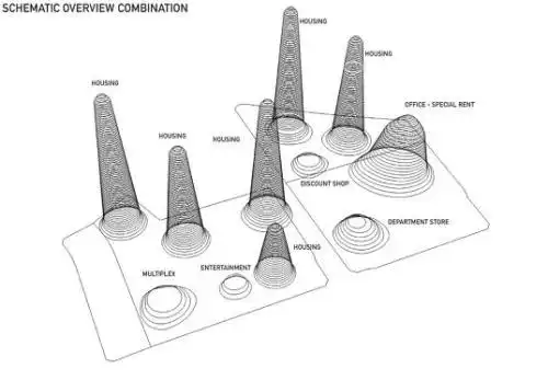 Генеральный план MVRDV включает пространства для жилья, офисные помещения, магазины и образовательные учреждения. Проект представляет собой сеть конструкций, возвышающихся в концентрические кольца, на каждом этаже города располагаются пышные зелёные насаждения, которые улучшают вентиляцию и снижают потребление энергии и воды. Внутренняя система орошения накапливает дополнительные запасы воды от зданий и использует её для поддержания этих зелёных фасадов. Представители компании MVRDV заявляют: Эта многостороння программа, которая может подстраиваться под различные условия фазирования, позиционирования и размера. Для того, чтобы это облегчить элементы спроектированы в форме колец. Если извлечь два таких кольца, каждая часть комплекса получит открытую террасу для жизни на отрытом воздухе.
