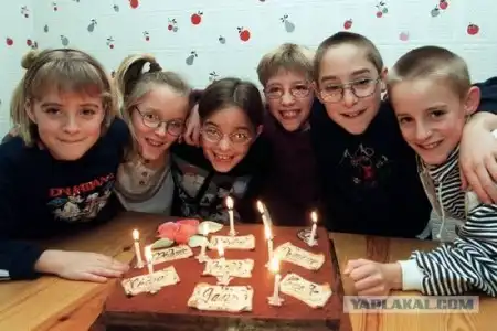 В 1989 году шестерняшки родились во Франции. На фото: Melanie, Doriane, Coralie, Gaelle, Cedric и Kevin празднуют 9й день рожденья.