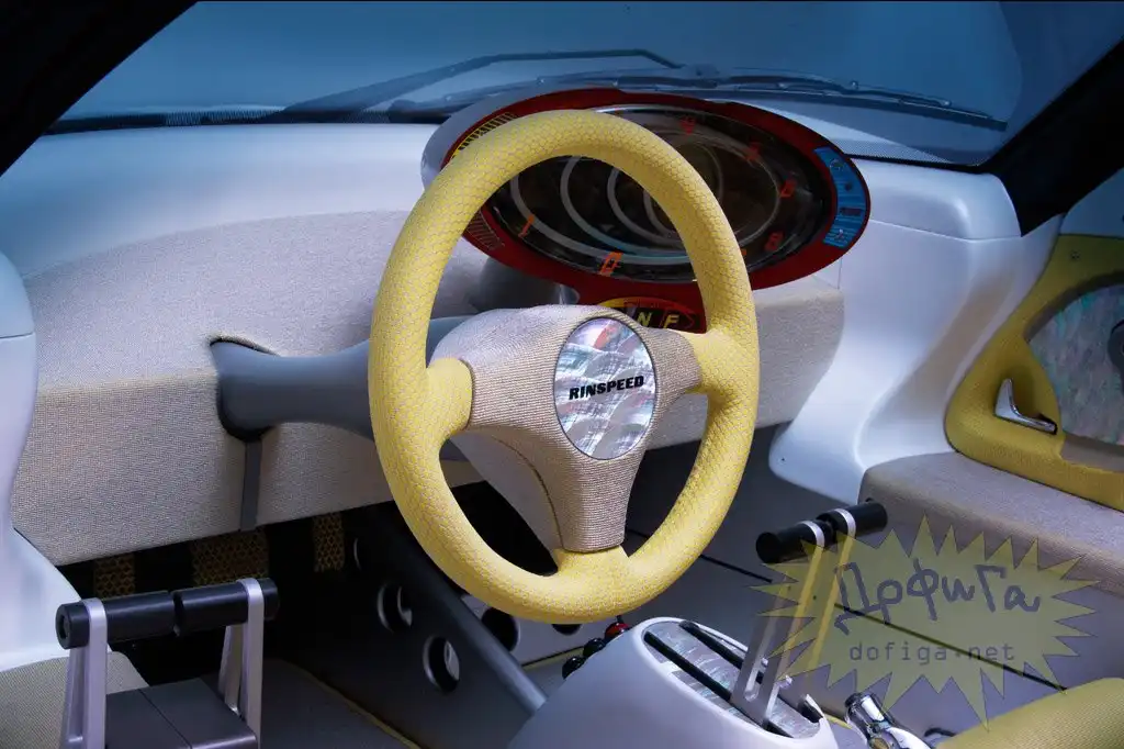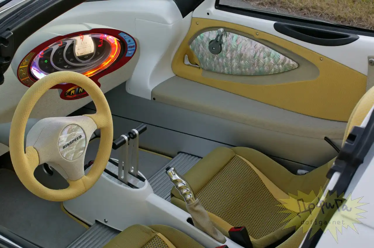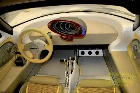 Отделка салона — легкие водостойкие материалы, рычаги в корабельном стиле и даже обивка внутренних панелей дверей под рыбью чешую. Под водой родстер sQuba обладает нейтральной плавучестью. Если водометы толкают его на глубину, он погружается, наоборот — всплывает.