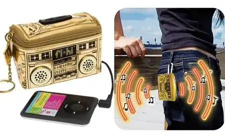 Золотистая сумочка Mini BoomBox является сумкой со стереодинамиками, в кол-ве 2. Через стандартный разъем 3.5 мм можно подключить любой источник аудио. Колонки спрятаны от воды, так что не бойтесь ни снега, ни дождя. Сколько стоит? А стоит сумочка $24.
