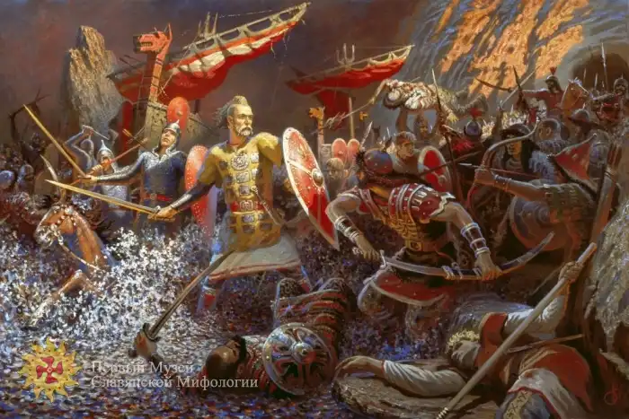 Именно эта последняя трагическая битва изображена Борисом Ольшанским. Святослав обнажил свой меч, дабы нанести решающий удар. Но не суждено храбрым ратичам вернуться на Родину. Печенежские князья и столетием позже поднимали окованный золотом кубок, сделанный из черепа Святослава Храброго, и пили из него вино, полагая, что к ним перейдет великая воинская мудрость и доблесть русского полководца. Пали Славные Воины в неравном бою, но оставили неизгладимый след в памяти потомков!