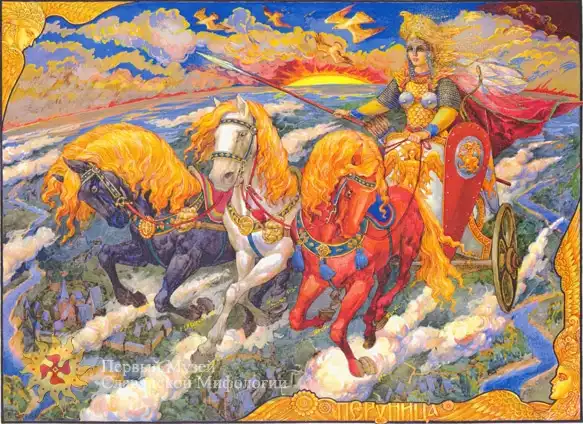 Эта богиня супруга бога Перуна (она - одно из воплощений Богини Лады). Ее порою называют дева-громовница, как бы подчерки¬вая, что она разделяет власть над грозами со своим мужем. Здесь выделяется ее воинственная сущность, именно поэтому столь часто упоминание о деве-воительнице в ратных заговорах древних славян: «Еду на гору высокую, по облакам, по водам (т. е. небесный свод), а на горе высокой стоит терем боярский, а во тереме боярском си¬дит зазноба красная девица, богиня Лада-Перуница. Вынь ты, девица, отеческий меч-кладенец; достань ты, девица, панцирь дедов¬ский, отомкни ты, девица, шлем богатырский; отопри ты, девица, коня ворона. Закрой ты, де¬вица, меня своею фатою от силы вражьей...»