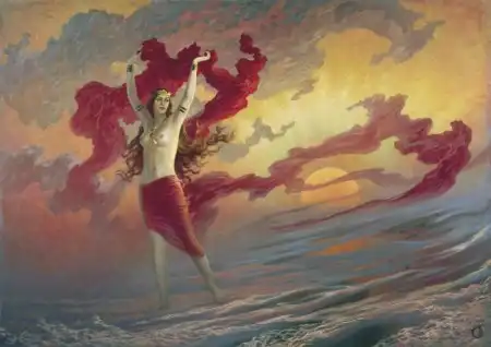 По преданиям, она выводит на небесный свод белых коней Солнца, а Вечерняя Заря их принимает. Чудесная розовая ткань – покрывало богини, застилающее небо с приходом зари, соткано из солнечных нитей, золотых и серебряных, с помощью волшебной самопрялки.